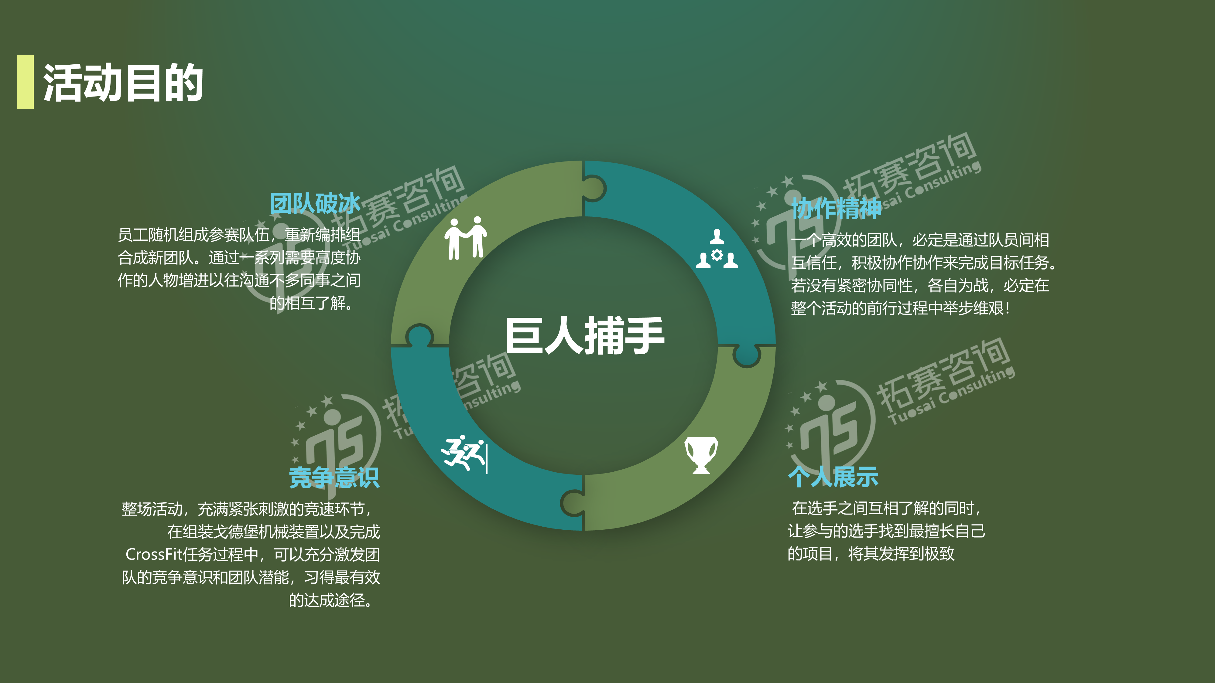 巨人捕手主题团建项目 通过结合代入感十足的电影IP,将戈德堡机械装置的组建与时下最热门的 CrossFit 健身项目进行有机的结合, 活动中,紧张的赛制安排、精美的道具与仪式感十足的环节在提升雇主品牌形象的同时,亦考验团队的协作能力,同时又提供了一个个人展现魅力的平台 。